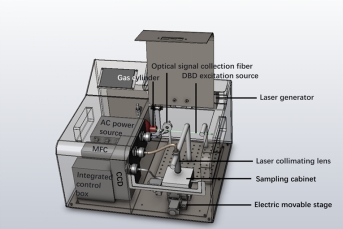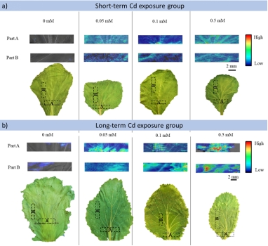 丁薛璐研究团队开发了一种创新型的小型化激光诱导解吸-低温等离子体激发元素光谱成像设备(LA-DBDI),该设备将低能耗二极管激光用于固体样本的定位和引入,将基于介电阻挡放电的大气压等离子体用于样品的原子化和激发,并集成高压交流供电装置、小型化CCD检测器、气体流量控制单元(图1)。通过优化等离子体气流、激光能量等设备参数,并确保适当的叶片湿度,实现了对植物叶片50μm横向分辨率的光谱成像。LA-DBDI可以追踪植物叶片在不同镉浓度和培养时间下,镉(图2)以及相关元素如钾、锌和O2+的积累情况。最终获得的在线成像和镉元素定量结果与常规实验室大型成像和定量仪器相媲美。LA-DBDI具有多种优势,包括样品处理最少、设备结构简单、操作便捷、检测灵敏度高(镉的检测限低至40 ppb)以及分析成本低廉。本研究表明,LA-DBDI可以成为一种跨学科应用的原位光谱成像工具,在复杂生物基质中的元素成像分析中发挥作用。