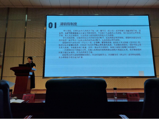会议最后,辅导员仇启荣向新生讲解公司日常管理相关规定,包括请销假制度、外出实习、违纪处分、研究生奖助学金以及其它常见问题。研究生秘书杨志宏介绍了实验室安全注意事项、研究生课程设置以及公司产品相关内容。