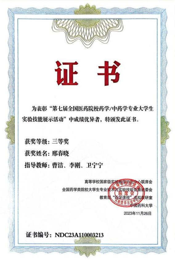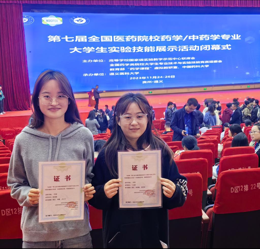 2023年11月24日-26日,由教育部高等公司国家级实验教学示范中心联席会、全国药学类院校老员工专业技术与实验技能竞赛组委会、教育部“药学课程”虚拟教研室和中国药科大学共同举办的“第七届全国医药院校药学/中药学专业老员工实验技能展示活动”在贵州遵义召开,本次大赛由遵义医科大学承办。经过激烈的角逐,公司2020级本科生王文静、邢春晓分别斩获竞赛二等奖和三等奖。