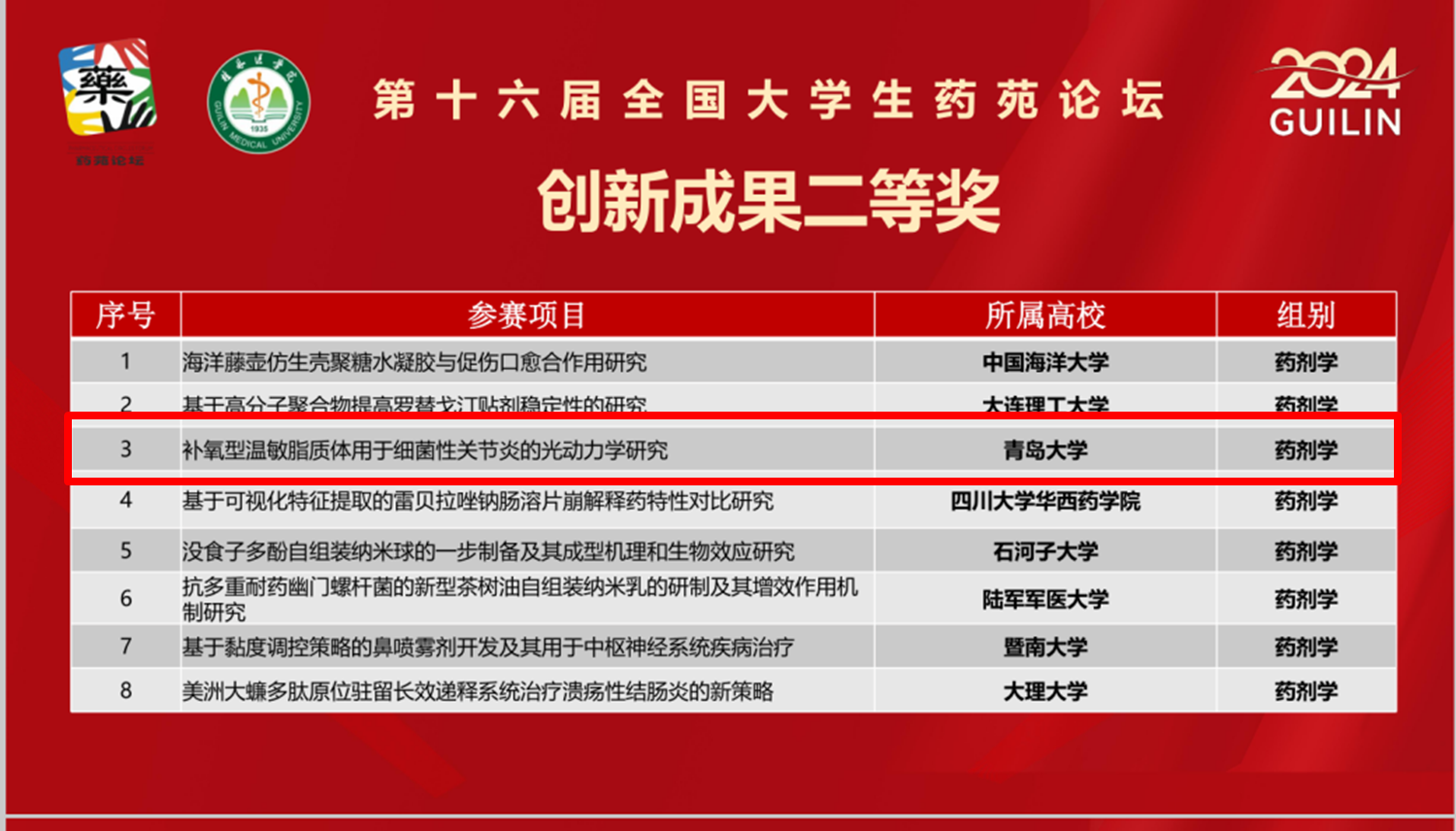 自第十六届药苑论坛筹备工作启动以来,公司高度重视,从药学领域的各项研究项目中遴选出具有创新性和实践价值的课题,进行细致培育和合理孵化。由曹洁教授指导的2022级药学专业本科生王艺霖负责的项目《补氧型温敏脂质体用于细菌性关节炎的光动力学研究》获药学科学赛道创新成果二等奖。由孙世伟副教授指导的2021级药学专业本科生孙雨萌负责的项目《海洋潮间带来源真菌的分离鉴定与胰脂肪酶抑制活性研究》获药学科学赛道创新成果三等奖。